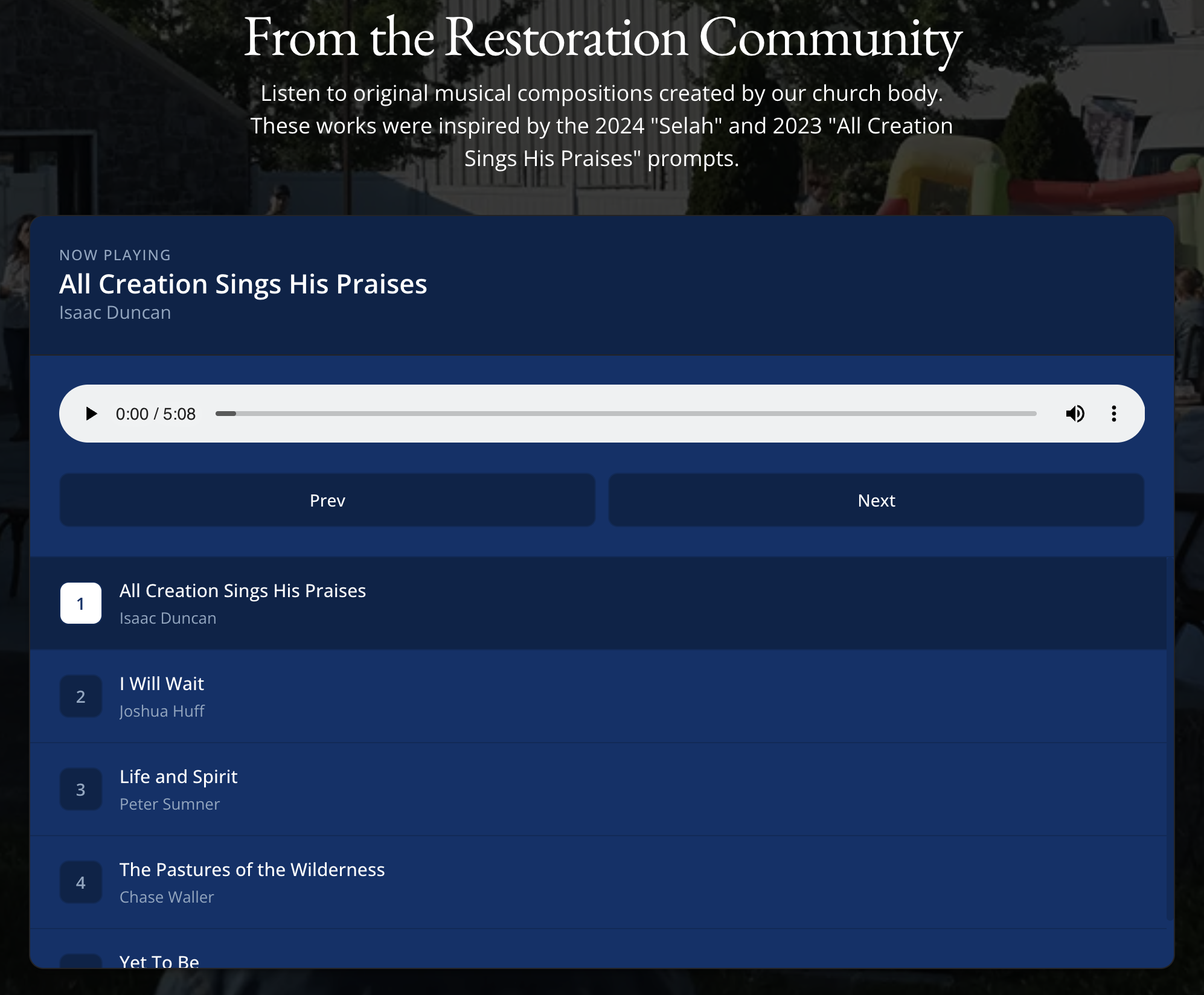 For the worship team, I built a custom songbook component using Webflow CMS and a custom JavaScript playlist. The worship director wanted to feature original songs from the congregation, which they'd been embedding one by one. Now they just add songs through the CMS and the playlist handles everything.